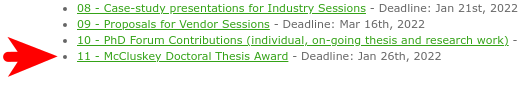 January 26th, 2022February 2nd, 2022 → McCluskey Doctoral Thesis Award submission deadline.- February 12th, 2022 → Notification of acceptance for presentation.